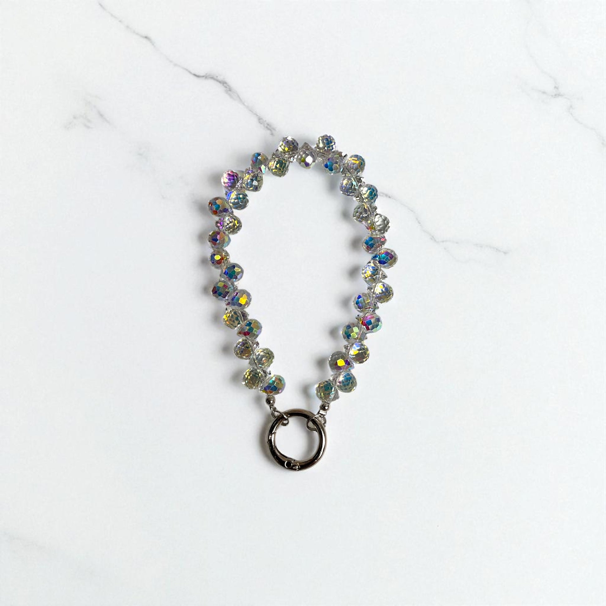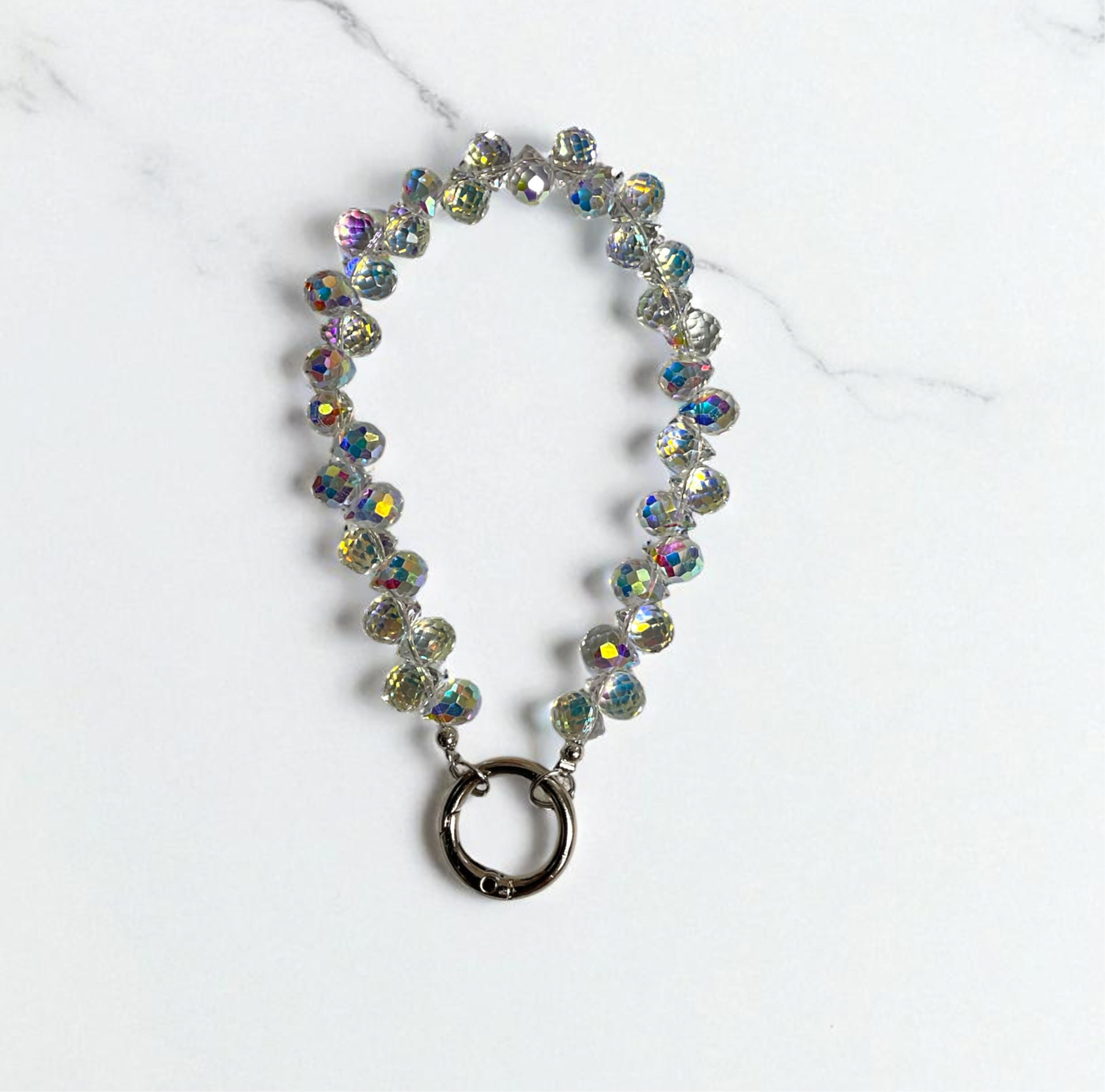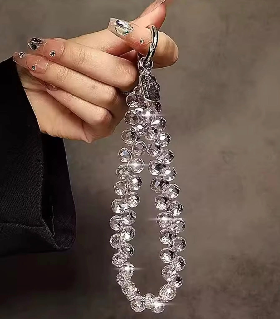 Add a touch of shimmer to your essentials with this Crystal AB beaded cellphone wristlet keychain—a versatile blend of elegance and practicality. Featuring luminous iridescent beads that catch the light beautifully, it doubles as a purse charm, keychain wristlet, or phone strap, making it both functional and stylish.
